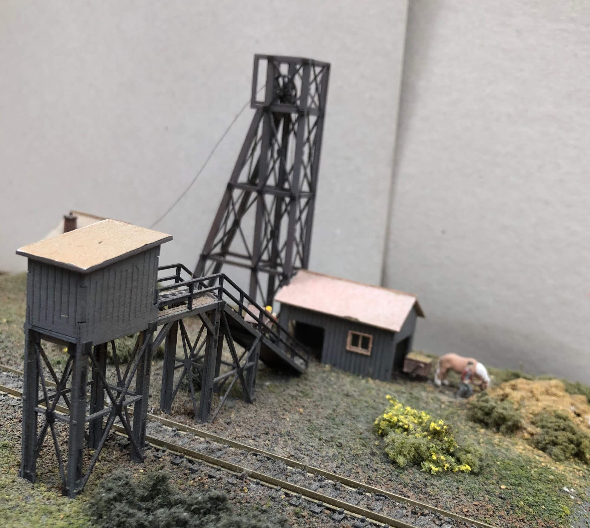 It includes laser cut plywood for the main structures, crimped metal for corrugated roofing and various whitemetal detail castings including a horse, mine cars, figures, sacks and simulated narrow track for the mine cars to run on.