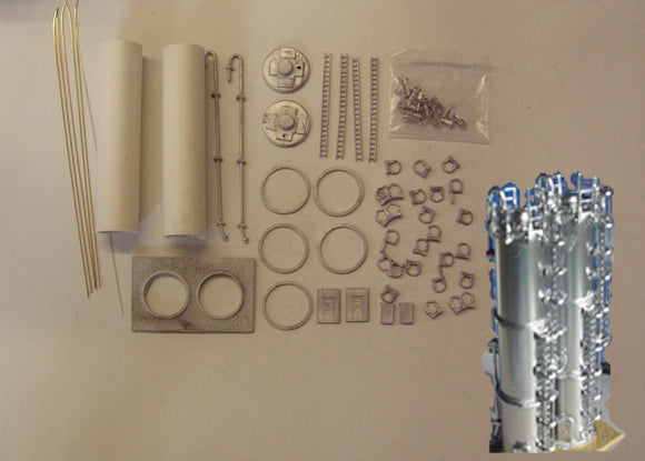 Our design is based on using off-the-shelf 21.5mm diameter tube. This has allowed us to simulate the smaller dry-bulk type Silos 3.3m dia. (11ft) x 15m high (49ft) approx. These silos complement our dry Bulk-Container transport range and are often seen in pairs or banks of four or more at local plastic-product producing factories around the country. They are ideal to tuck away in a spare corner of a railway layout showing the transfer activity as the transported bulk-container is tipped and its contents pumped into the Silos via a mobile pumping unit - these items being available separately. To maximize positioning possibilities the lower side discharge system pipe-work sometimes seen has not been included, it being assumed it runs down into the concrete plinth and continues underground onto the various factory supply points.