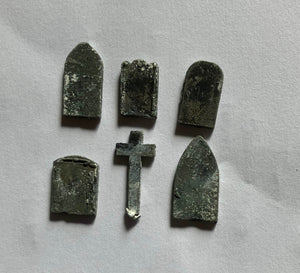 Pack contains 6 different gravestones (designs may vary slightly as the 6 pieces are chosen from 9 available designs).
